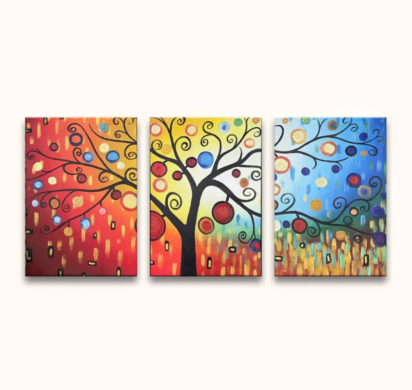 Handgeschilderd 3-luik schilderij ‘Appelboom’. Olieverfschilderij van hoge kwaliteit waarbij een appelboom door middel van abstracte speelse schilderkunst zijn afgebeeld.