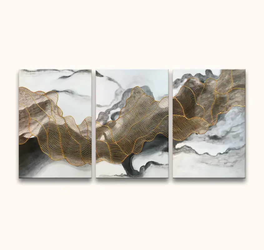 Handgeschilderd 3-Luik Schilderij Goudweb. Acrylverfschilderij van hoge kwaliteit waarbij een gouden webstructuur op witte en schakeringen van verschillende grijstinten, door middel van moderne schilderkunst is afgebeeld.