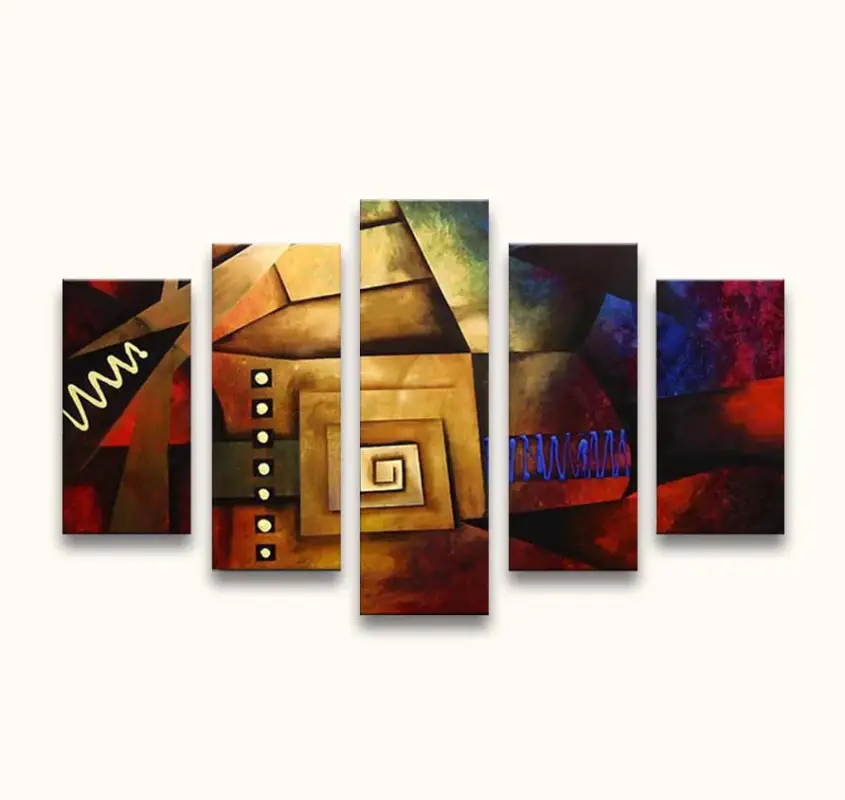 Handgeschilderd 5-Luik Schilderij Abstract Cubism. Olieverfschilderij van hoge kwaliteit waarbij abstracte kubistische vormen door middel van moderne paletmes schilderkunst zijn afgebeeld.