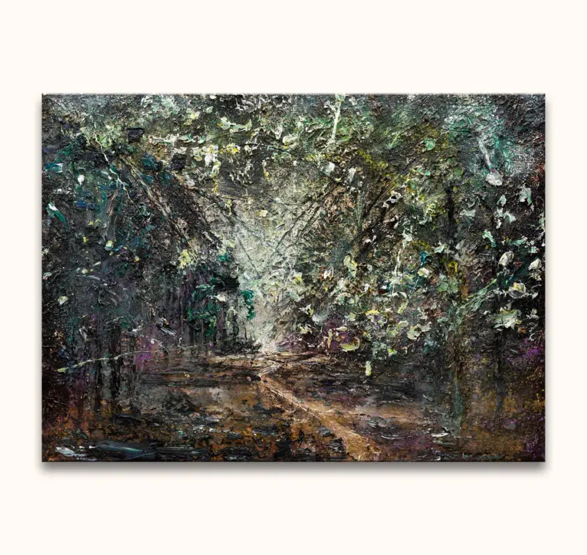 Handgeschilderd schilderij ‘Waldsteig’ van Anselm Kiefer. Olieverfschilderij van hoge kwaliteit waarbij een bospad door middel van moderne schilderkunst is afgebeeld.