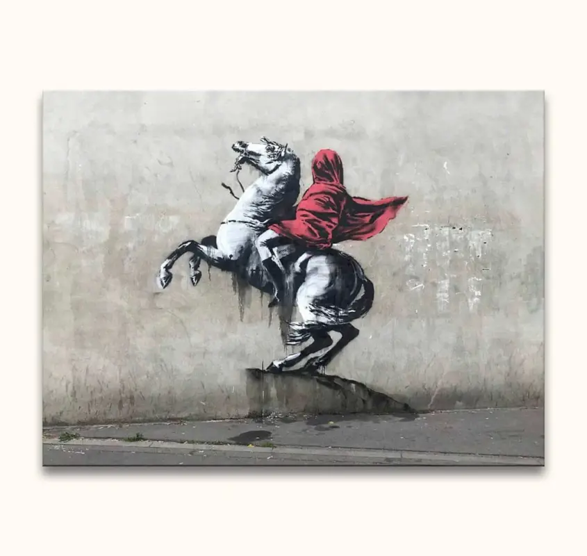 Handgeschilderd Street Pop Art schilderij ‘Red Horseman’ van Banksy. Olieverfschilderij van hoge kwaliteit waarbij een ruiter op zijn paard door middel van moderne street art is afgebeeld.