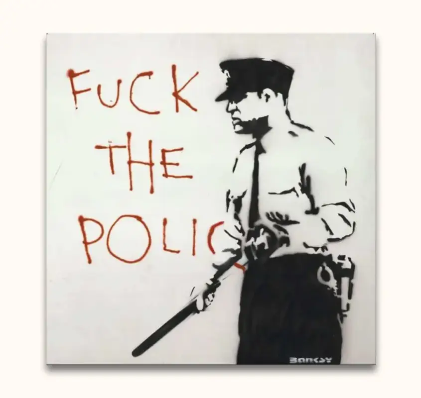 Handgeschilderd Street Pop Art schilderij ‘To Serve and Protect’ van Banksy. Olieverfschilderij van hoge kwaliteit waarbij een politie agent, met daarnaast een beledigende graffiti tag, door middel van moderne graffiti art zijn afgebeeld.