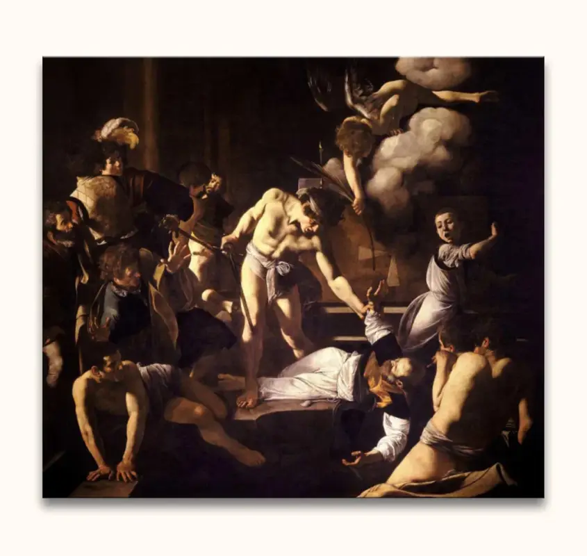 Handgeschilderd schilderij ‘The Martyrdom of Saint Matthew’ van Caravaggio. Olieverfschilderij van hoge kwaliteit waarbij Sint Matheus door middel van klassieke schilderkunst is afgebeeld.