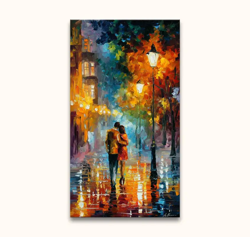 Origineel handgeschilderd schilderij ‘Love Street’ Leonid Afremov signature, door Grootmeesters. Modern olieverfschilderij van hoge kwaliteit waarbij de unieke schoonheid van een man en vrouw door middel van impressionistische schilderkunst zijn afgebeeld. Dit is een origineel werk geïnspireerd door de stijl van Leonid Afremov, geen reproductie.