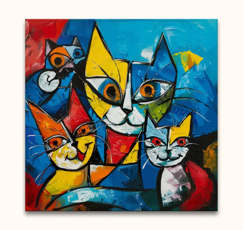 Handgeschilderd schilderij Cat Lovers 3 – Pablo Picasso signature. Modern olieverfschilderij van hoge kwaliteit waarbij vier katten door middel van kubistische schilderkunst zijn afgebeeld.