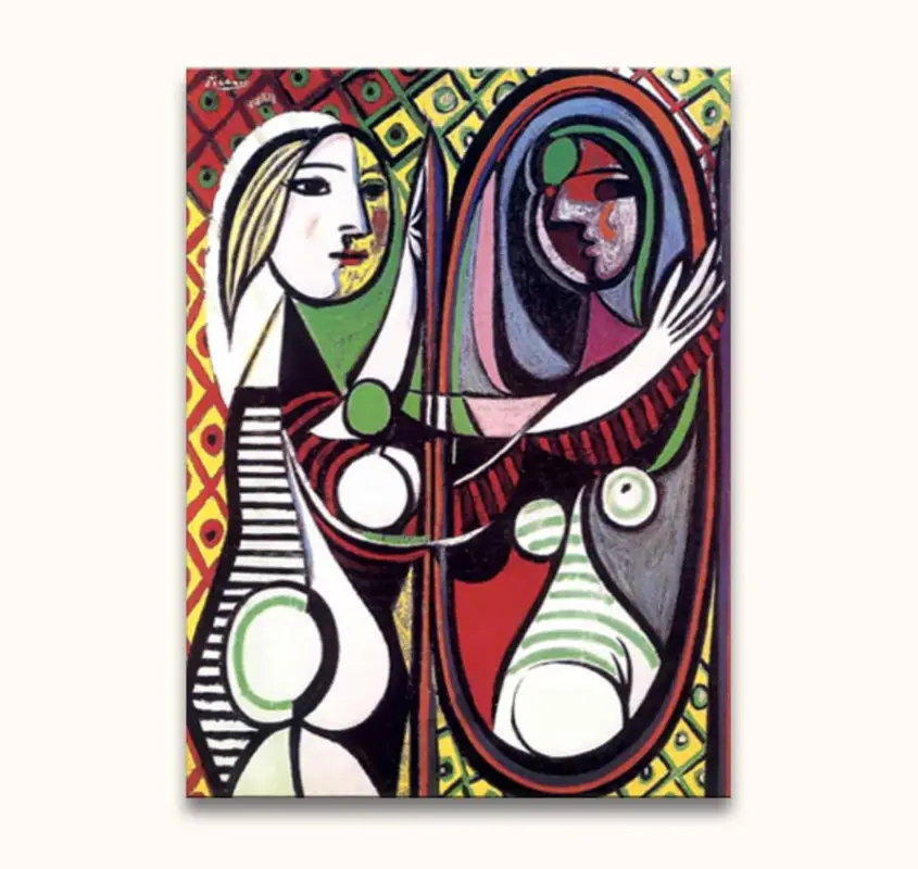 Handgeschilderd schilderij Minnares bij de Spiegel – Pablo Picasso signature. Modern abstract olieverfschilderij van hoge kwaliteit waarbij één van Picasso’s minnaressen door middel van kubistische schilderkunst is afgebeeld.