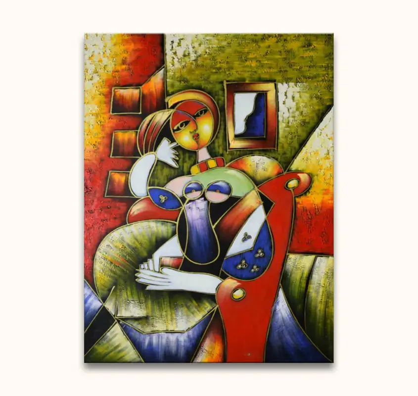 Handgeschilderd schilderij Vrouw op Sofa – Pablo Picasso signature. Modern abstract olieverfschilderij van hoge kwaliteit waarbij een vrouw door middel van kubistische schilderkunst is afgebeeld.