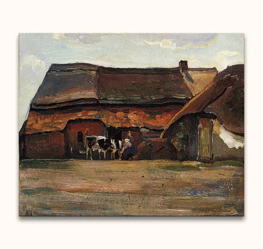 Handgeschilderd schilderij ‘Brabantse Boerderij’ van Piet Mondriaan. Olieverfschilderij van hoge kwaliteit waarbij een boerderij woning door middel van moderne schilderkunst is afgebeeld.