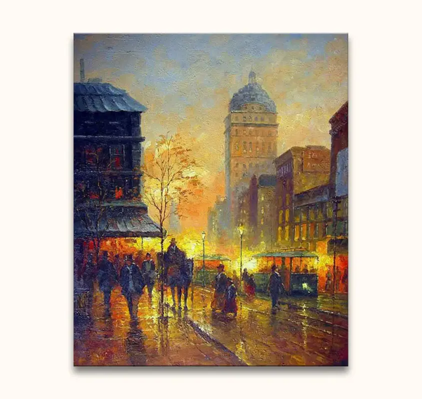 Handgeschilderd olieverfschilderij ‘Sunset in Paris’ van René Rambert. Olieverfschilderij van hoge kwaliteit waarbij Parijs in eind 19de eeuw door middel van romantische schilderkunst is afgebeeld.