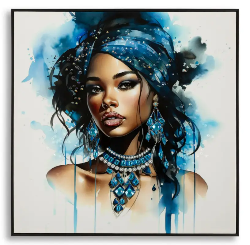 Schilderen op canvas compleet met houten frame en metalen frame met vrouw in een blauwe tulband en sprankelende sieraden. Met verhoogde applicaties. Maat cm 82x4x82, framedikte 4 cm.