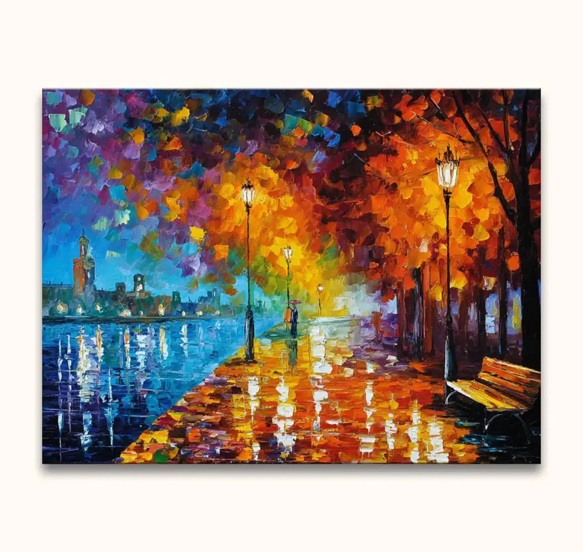 Origineel handgeschilderd schilderij ‘Waterkant’ Leonid Afremov signature, door Grootmeesters. Modern olieverfschilderij van hoge kwaliteit waarbij de unieke schoonheid van de een park aan het water door middel van impressionistische schilderkunst is afgebeeld. Dit is een origineel werk geïnspireerd door de stijl van Leonid Afremov, geen reproductie.