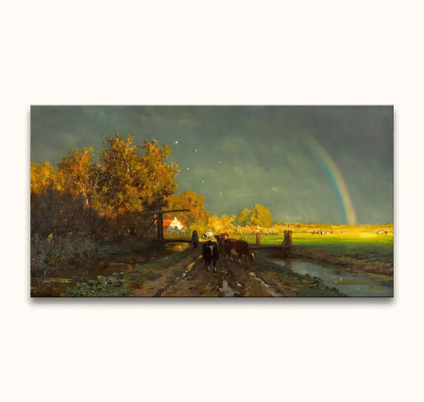 Handgeschilderd olieverfschilderij ‘De Regenboog’ van Willem Roelofs. Olieverfschilderij van hoge kwaliteit waarbij een landschap met regenboog door middel van impressionistische schilderkunst is afgebeeld.