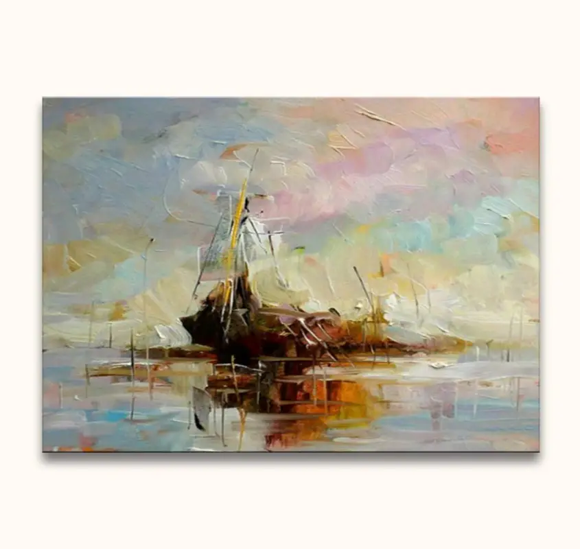 Handgeschilderd olieverfschilderij ‘Windstil bij Ameland’. Olieverfschilderij van hoge kwaliteit waarbij boten, die voor de kust van Ameland aan anker liggen bij windstilte, door middel van romantische schilderkunst is afgebeeld.