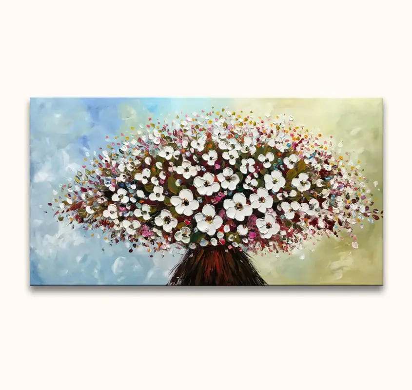 Handgeschilderd schilderij Wit Roze Bloemen. Olieverfschilderij van hoge kwaliteit waarbij een bos witte en roze bloemen in bloei door middel van moderne paletmes schilderkunst is afgebeeld.