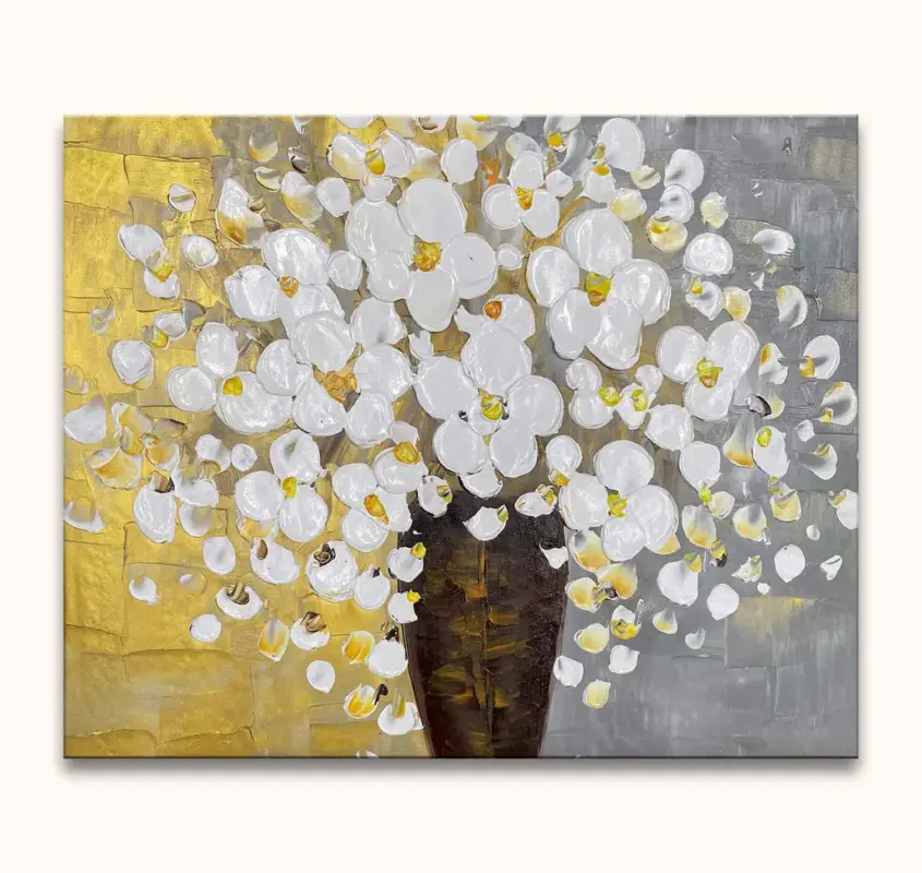 Handgeschilderd schilderij Witte Bloemen in Vaas. Olieverfschilderij van hoge kwaliteit waarbij een bos witte bloemen in bloei door middel van moderne paletmes schilderkunst is afgebeeld.