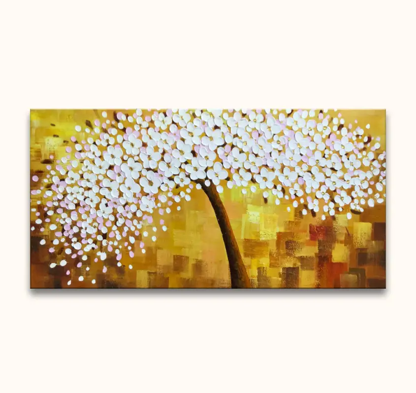 Handgeschilderd schilderij Zoete Kersbloesem. Olieverfschilderij van hoge kwaliteit waarbij een zoetekersprunus in bloei door middel van moderne paletmes schilderkunst is afgebeeld.